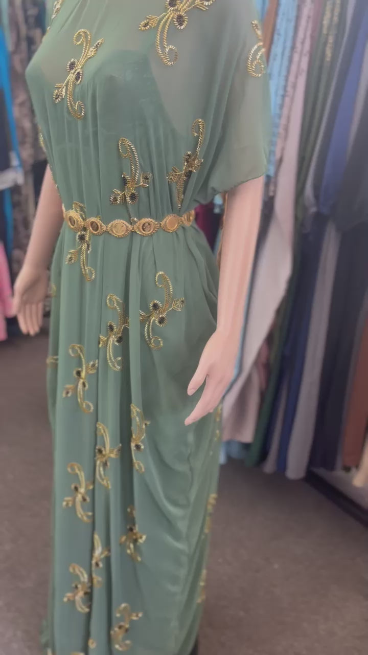 Mint green, stitched Yemeni party dress with inner slip/gown